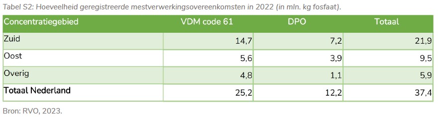 In 2022 is voor 37,4 mln. kg fosfaat aan mestverwerkingsovereenkomsten geregistreerd. Dit is de hoeveelheid fosfaat die bij RVO wordt geregistreerd in het kader van het voldoen aan de mestverwerkingsplicht. Dit is dus veel meer dan het landelijke mestoverschot.