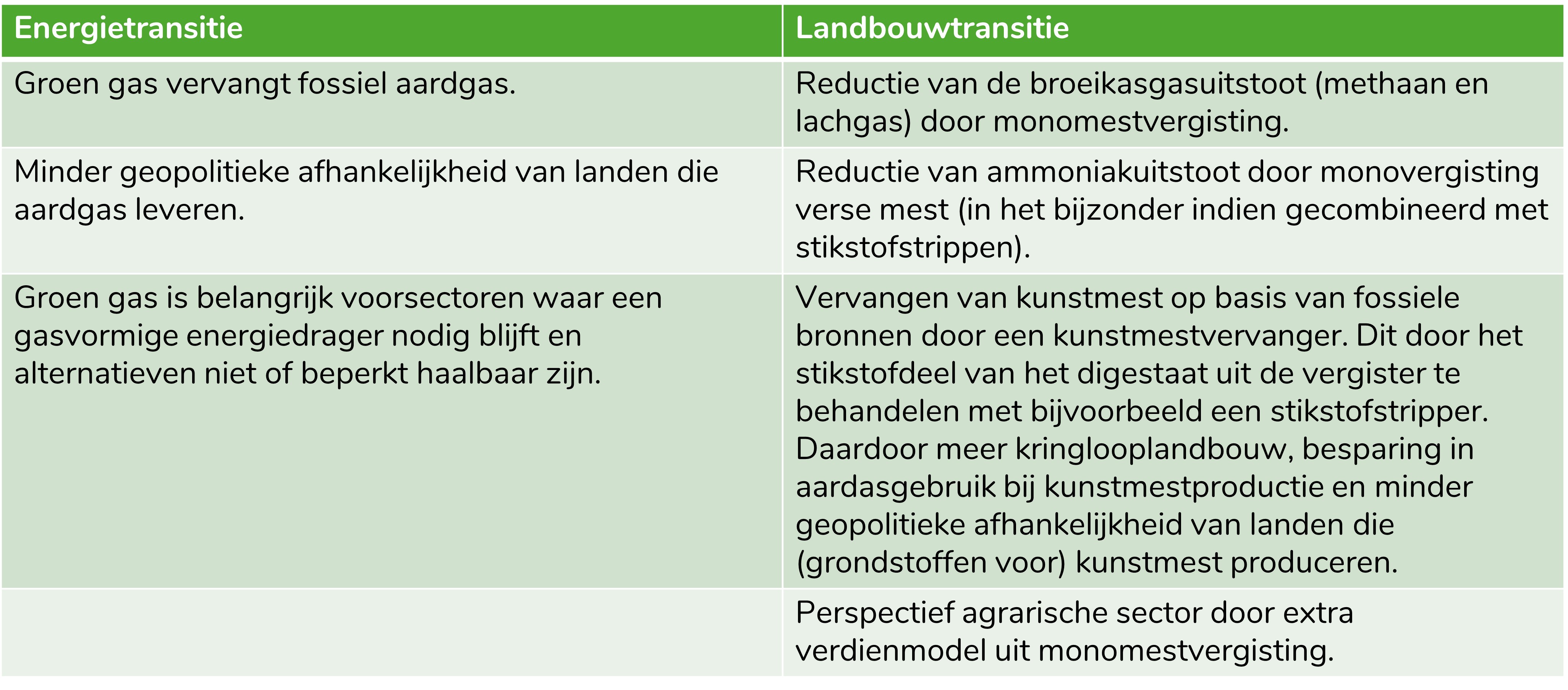 Monomestvergisting kan een rol vervullen in zowel de energie- als de landbouwtransitie. Potentiële voordelen van monomestvergisting zijn: groengasproductie, emissiereductie (ammoniak en broeikasgassen), vervangen van kunstmest, versterken van kringlooplandbouw en bieden van een extra verdienmodel voor agrariërs. Monomestvergisting is geen oplossing voor het mestoverschot omdat het digestaat dat uit de vergister komt het reguliere mestcircuit weer in gaat.