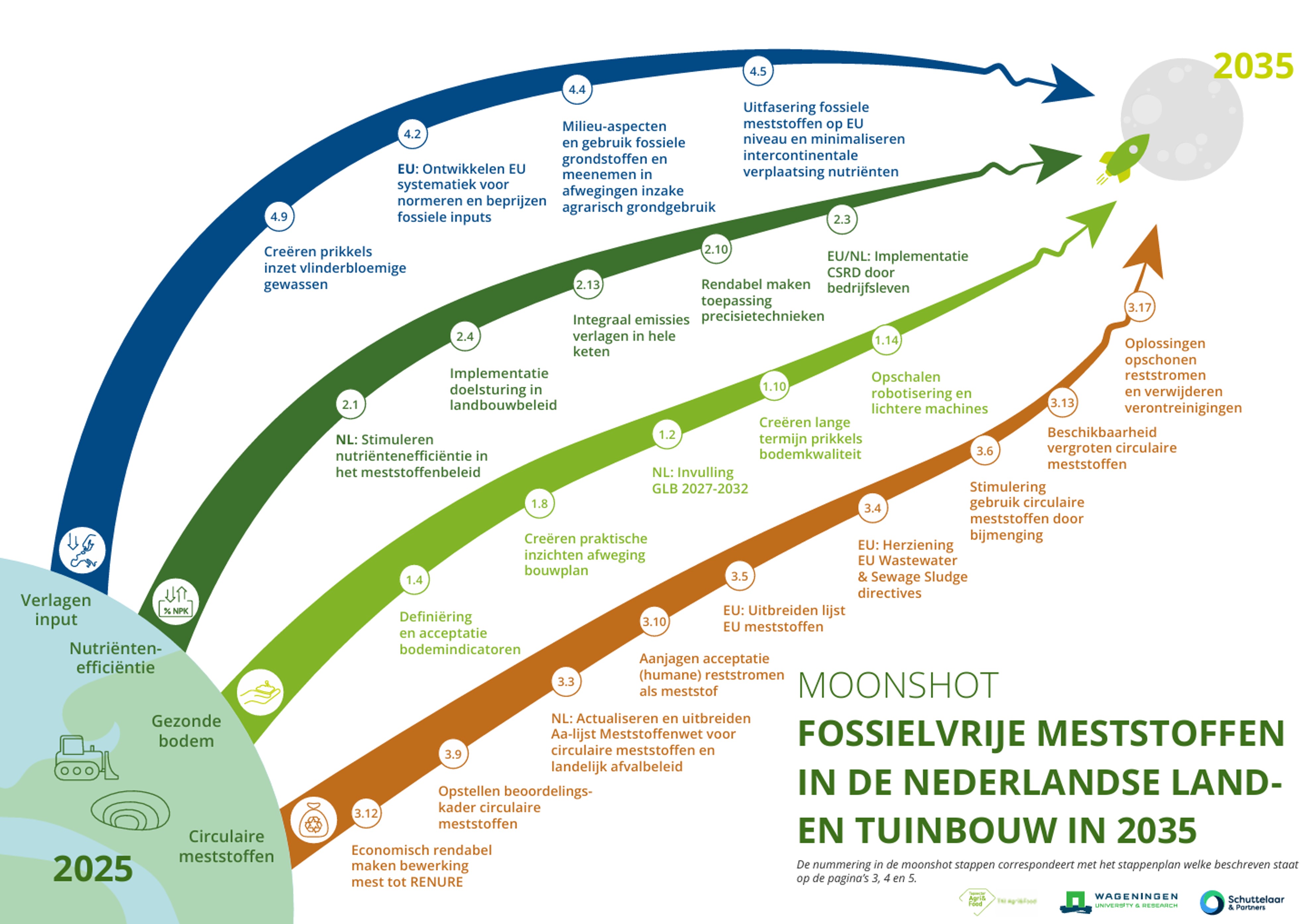 In opdracht van de topsector Agri & Food hebben Wageningen Research en Schuttelaar & Partners de ‘Moonshot fossielvrije meststoffen 2035’ gemaakt. Het geeft een route naar een Nederlandse bemestingspraktijk waarbij van lineaire (fossiele, gemijnde) meststoffen wordt overgegaan naar hergebruik van reststromen als mest, afvalwater, slib en dergelijke. Dit is belangrijk als onderdeel van de klimaataanpak en om minder uit de voorraden van de aarde de putten, en om minder afhankelijk te worden van importen van buiten de EU.
