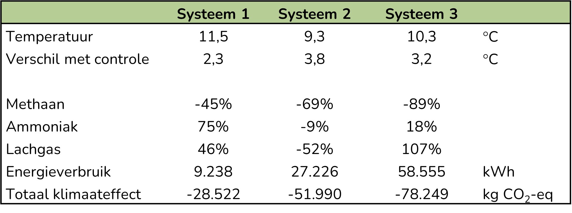 De methaanemissie wordt fors teruggedrongen, en dit klimaateffect is groter dan het energieverbruik en de hogere lachgasemissie die bij twee van de drie behandelingen werd waargenomen.